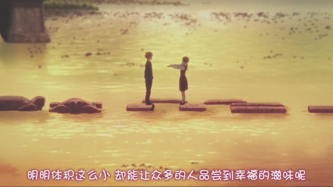 终于到了放学,饼藏和玉子一块来到了桥边,而我们的饼藏还带上了羁绊之证——土制的纸杯电话,打算不顾一切的表露心意。但……现实是,该是说迟钝或是呆萌呢,我们的玉子捡到了一块很像大福的石子,开始自言自语的说自己想要继承家业。饼藏看到这个场景, 大概是想守护这种平静的日常吧,打消了主意。但是玉子的一番话,努力地表达了自己的小小的但却又很幸福的梦想。